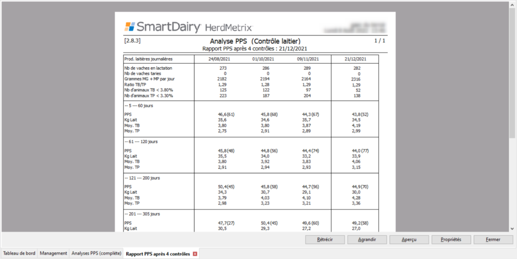 Pour accéder à cet écran suivez le chemin Management/Production laitière/Analyse PPS/Rapport après 4 contrôles.