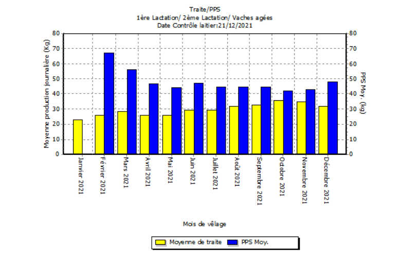 Ce rapport présente dans une table, l’évolution du nombre moyen de jours de lactation, du PPS et des analyses de lait en fonction des mois de vêlage des animaux. En dessous, un graphique montre l’évolution comparée des valeurs de production laitière et du PPS en fonction des mois de vêlage.