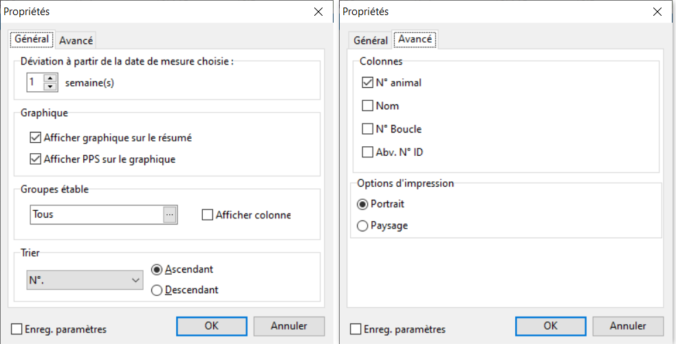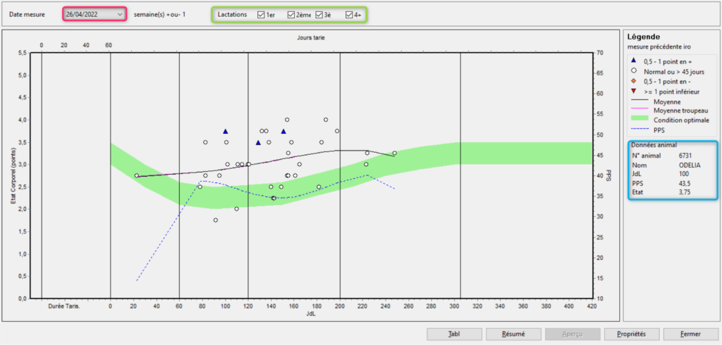 Vous pouvez activer ou désactiver les options « afficher le graphique sur le résumé », « afficher PPS sur le graphique ». Vous pouvez également sélectionnez un ou plusieurs groupes étable. Enfin vous pouvez choisir d’afficher ou non, différentes informations sur les animaux.