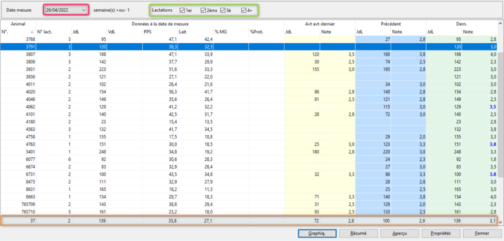- le numéro de lactation (1ère, 2ème, 3ème, 4ème et plus) (encadré en vert)