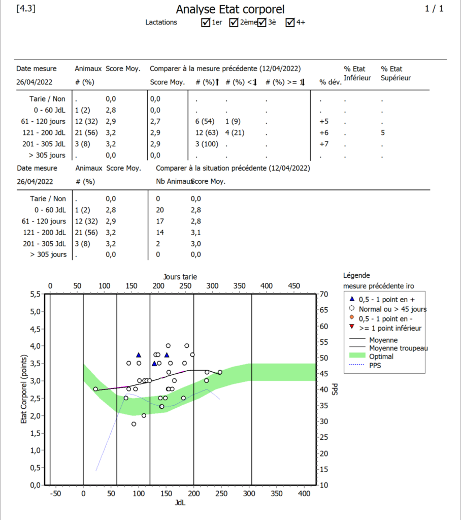 La bande verte représente l’état corporel optimal en fonction du jour de lactation. On peut donc facilement comparer cet état optimal à l’état des animaux.