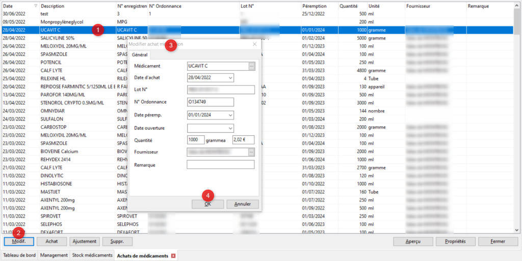 En cas d’erreur dans l’enregistrement de l’achat ou si vous souhaitez compléter les informations déjà renseigner il est possible de modifier l’enregistrement d’un achat. Dans la liste de vos achats, choisissez l’enregistrement à modifier en cliquant (gauche) une fois sur la ligne (1). Elle se colorera en bleu. Cliquez ensuite sur le bouton [Modif.]. La même fenêtre que pour enregistrer un achat s’ouvre avec les informations que vous aviez complétées lors de l’enregistrement de l’achat. Complétez/modifiez les informations (3) puis cliquez sur [OK] (4).