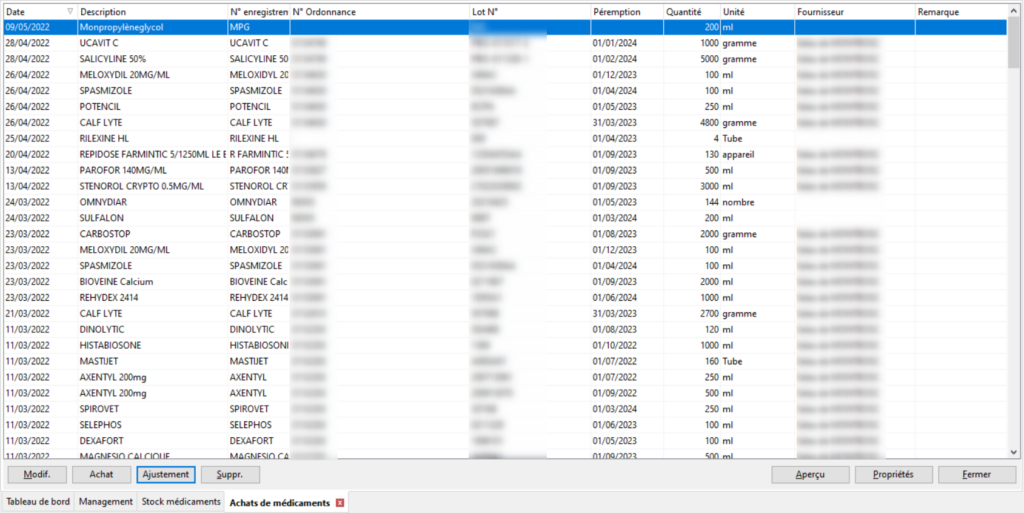 Il est possible de gérer son stock de médicaments dans le logiciel mais ce n’est pas obligatoire. Pour gérer votre stock de médicaments avec le logiciel vous devez rentrer tous vos achats de médicaments en vous rendant dans Management/Santé et traitements/Achats de médicaments. Dans cet écran vous retrouverez la liste de vos achats.