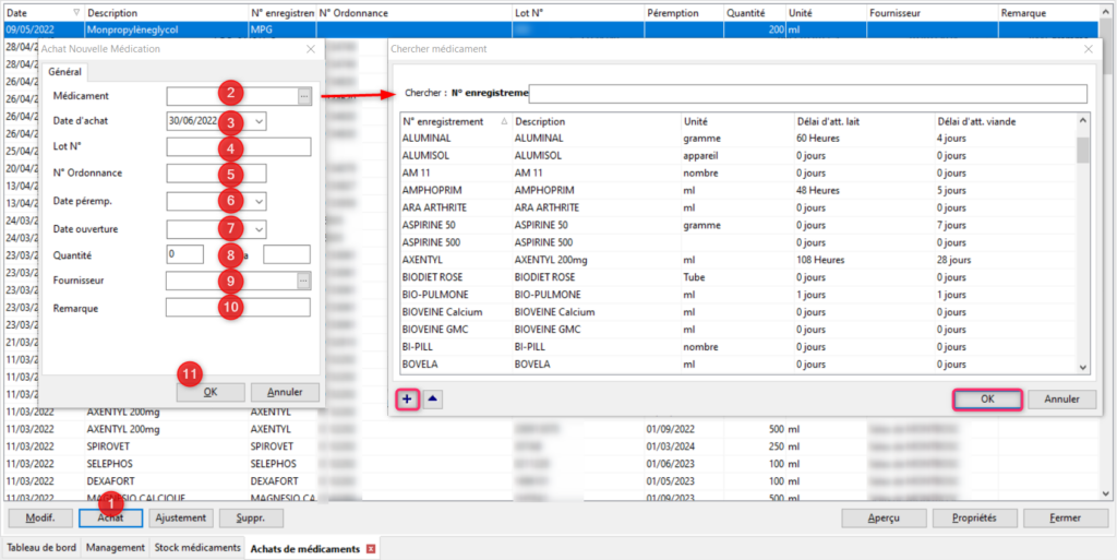 Pour enregistrer un achat de médicament cliquez sur le bouton [Achat] (1). Une petite fenêtre s’ouvre. Renseignez les différentes informations: