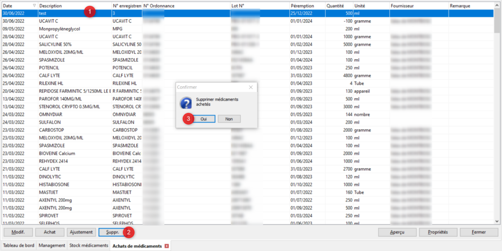 Pour supprimer un achat, sélectionnez le dans la liste (clic gauche sur la ligne sui se colorera en bleu) (1). Cliquez sur le bouton [Suppr.] (2). Un message apparait pour vous demander confirmation, si vous êtes sûr de vouloir supprimer l’achat cliquez sur [Oui] (3).