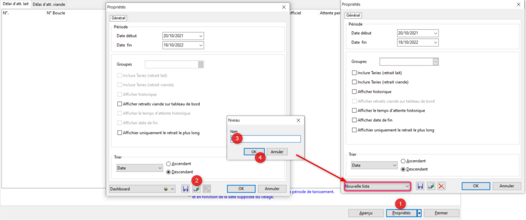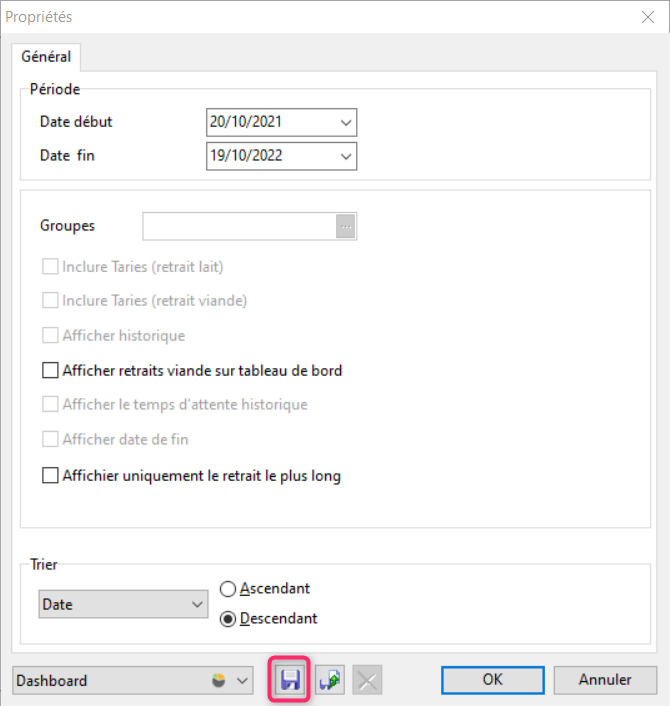 - case « Afficher retraits viande sur tableau de bord »: cochez là pour que les délais de retrait viande s’affiche (par défaut seule les délais lait sont affichés)