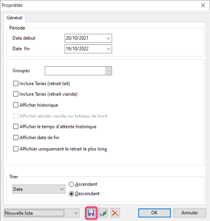- case « inclure tarie » (lait/viande): par défaut les délai pour les vaches taries ne sont pas affichées mais vous pouvez les mettre en cochant cette case