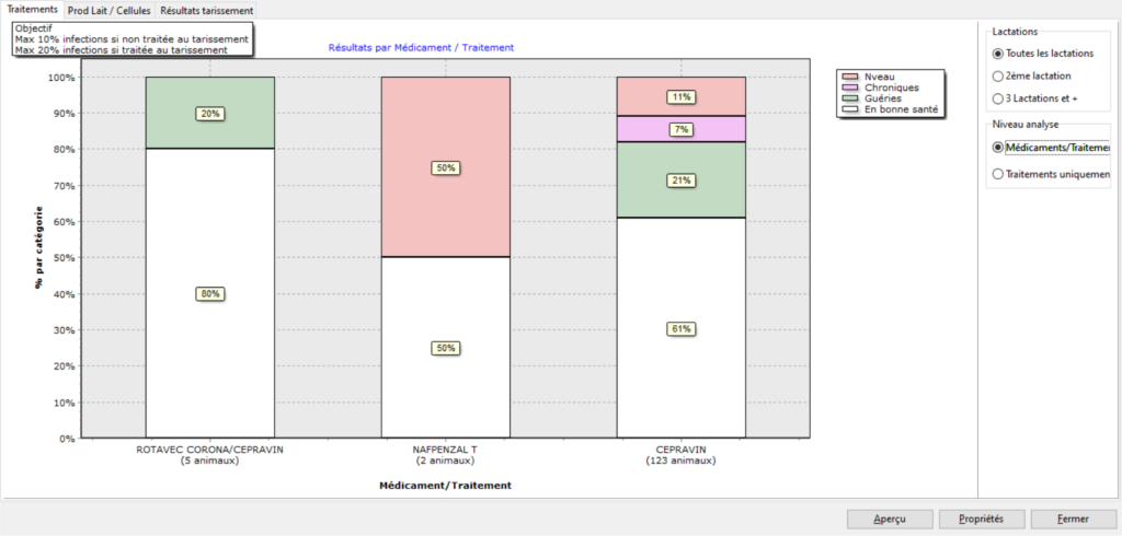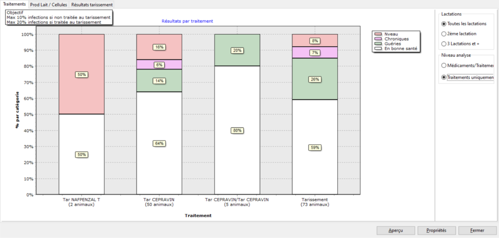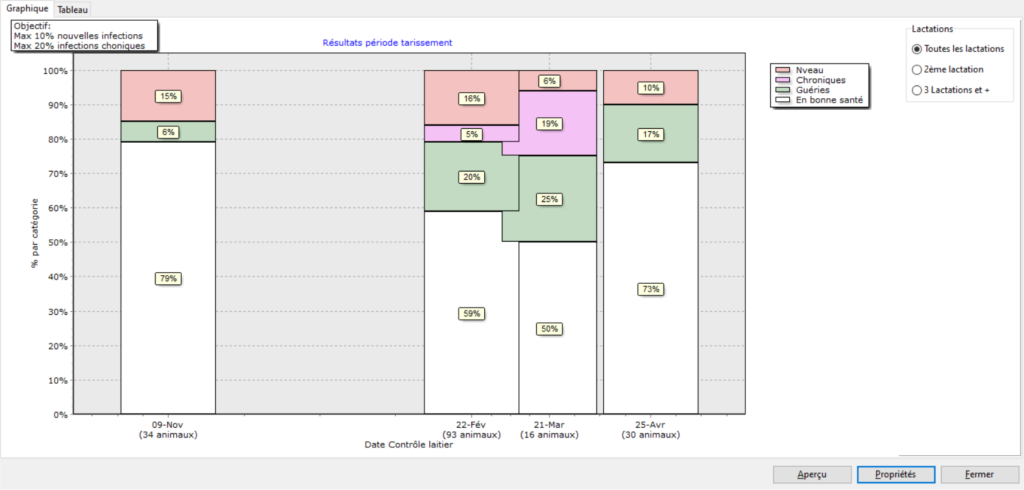 On utilise les mêmes catégories que dans le menu 4.10.1 Résultat tarissement (en bonne santé, guéries, chroniques, nouvelle infection).