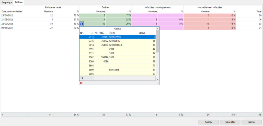 Si vous placez votre souris sur une des cases « Nombre », une petite icône [i] apparait. En cliquant dessus, le détail des animaux s’affiche.
