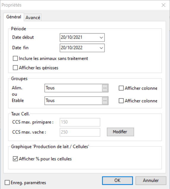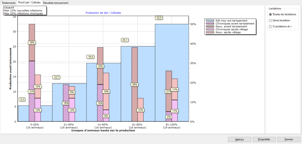- afficher (en cochant) ou non (en décochant) les pourcentages d’infection sur le graphique Prod lait/cellules