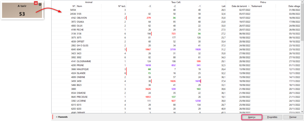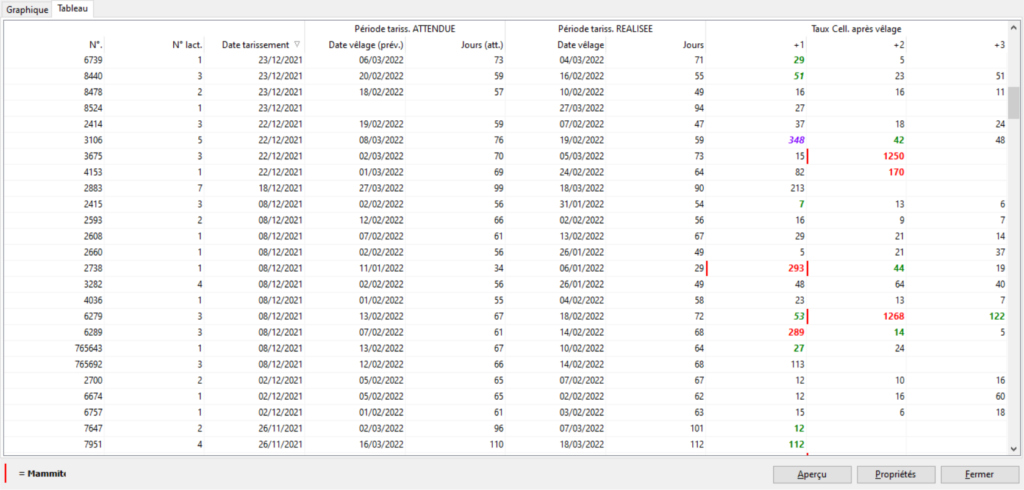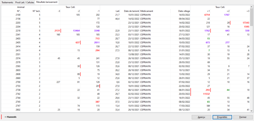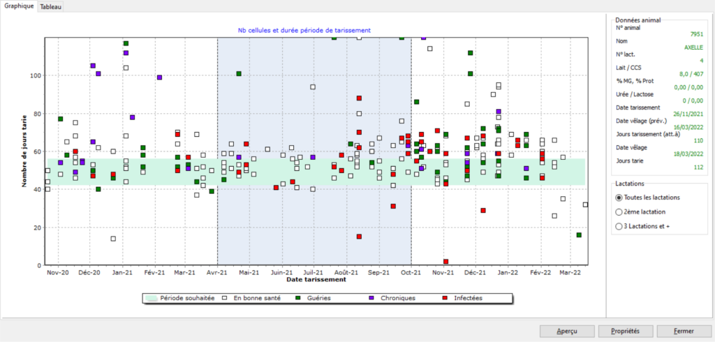 Le but est de visualiser combien de temps les animaux restent taris et de tenir compte de leur taux cellulaire.