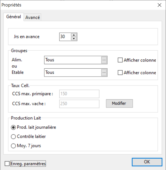 Pour choisir combien de jours à l’avance par rapport à sa date de tarissement prévue un animal doit être comptabilisé pour la tuile du tableau de bord il faut aller dans les propriétés.