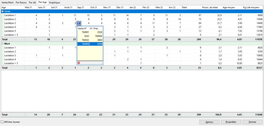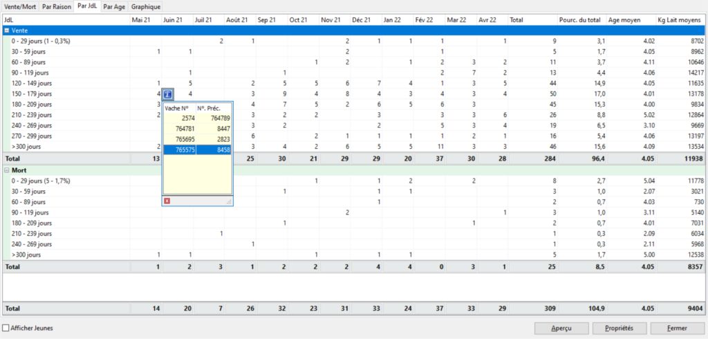Dans cet onglet, les ventes et les morts sont triées par jour de lactation (en ligne) et par mois (en colonne). La production moyenne ainsi que l’âge moyen pour chaque intervalle de jour de lactation sont donnés en fin de ligne. En fin de catégorie, vente ou mort, on retrouve les totaux.