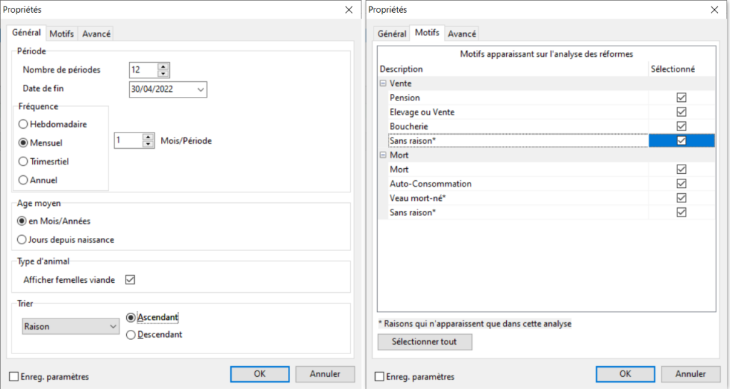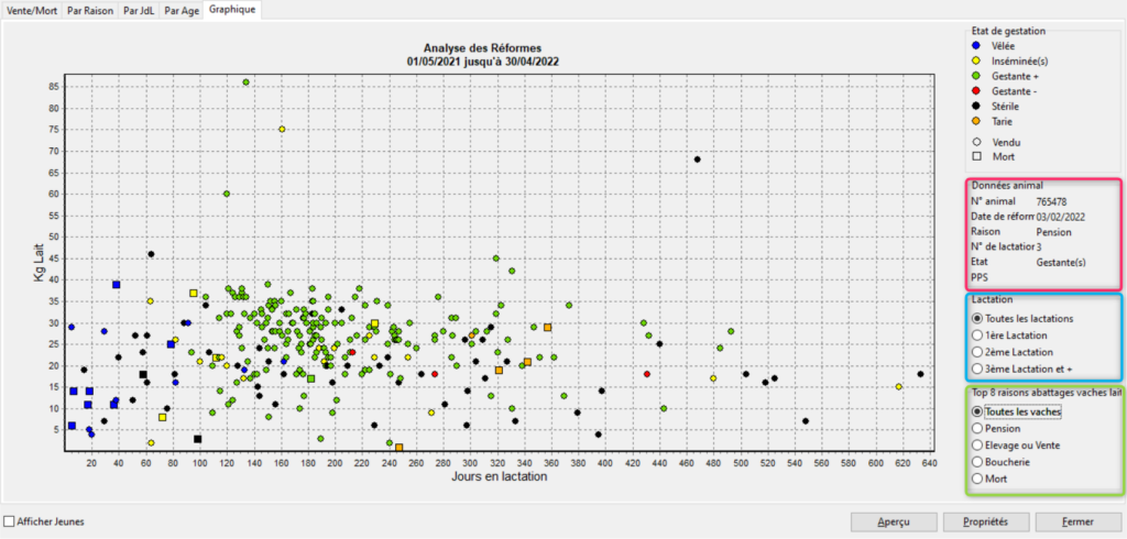 Le menu est accessible en suivant Management/Santé/Analyse des réformes (menu 4.17). Il vous permettra d’analyser les ventes et les morts avec une liste des animaux, un tableau par raison, un tableau par âge, un tableau par jour de lactation et un graphique.