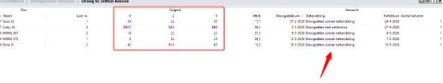 Zo krijg je onder andere meer inzicht in de celgetalwaarden (de laatste drie metingen vóór droogzetten), het behandelingsadvies met betrekking tot wel of geen antibioticabehandeling, de laatste melkproductie en het aantal kalveren van de dracht.