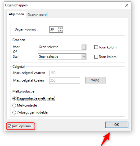 Via de knop [Eigenschappen] rechtsonder kun je het overzicht verder naar wens aanpassen. Denk hierbij aan het aantal dagen vooruit, het wel of niet meenemen van bepaalde groepen, de grenswaarde voor verhoogd celgetal en de weergave van de melkproductie: