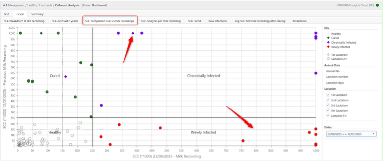 This overview compares individual animals based on their somatic cell count during the last two milk recordings. A new distinction has been introduced between: